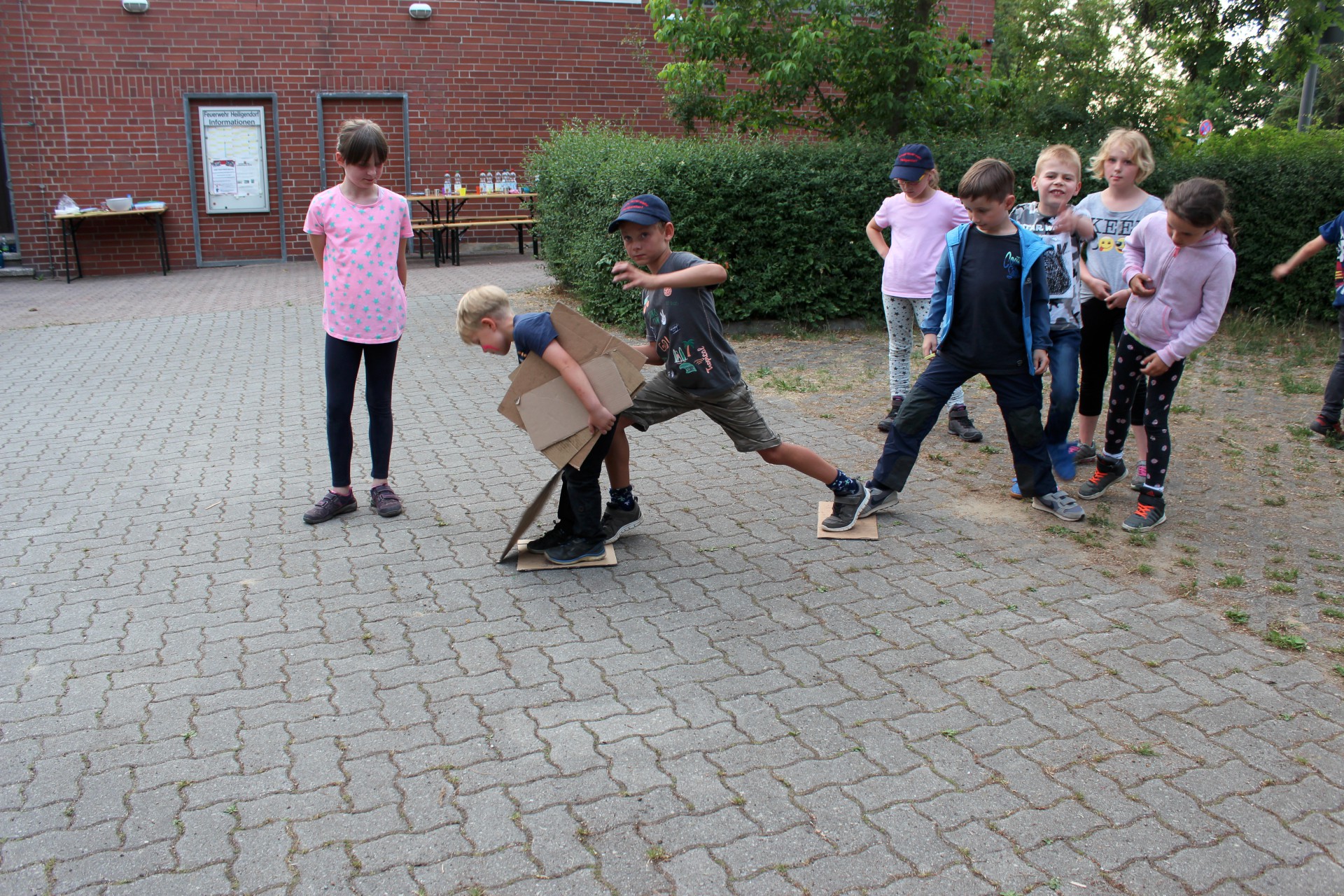Nach dem gemeinsamen Abendessen zum Start bekamen die Kinder im Rahmen der Brandschutzerziehung in zwei Gruppen ihre Streichholzausbildung, während die jeweils andere Gruppe erst Steine für das "Kinderfeuer" sammelte und sich dann mit dem Gruppenspiel "Flussüberquerung" als "Team-bildender Maßnahme" beschäftigte.