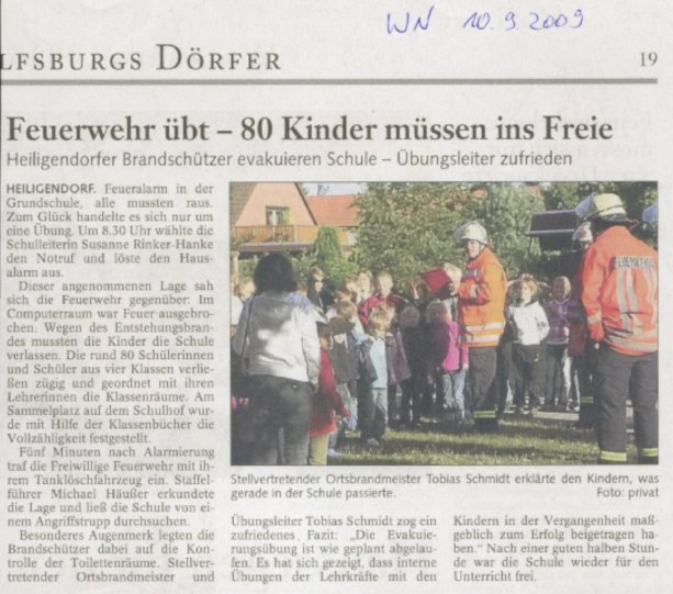 | 10.09.2009 | WN | Bericht über eine Evakuierungsübung in der Grundschule Heiligendorf |