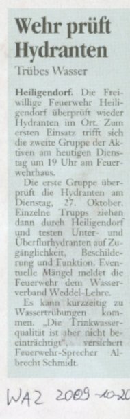 | 20.10.2009 | WN | Bericht über die bevorstehende Hydrantenüberprüfung |