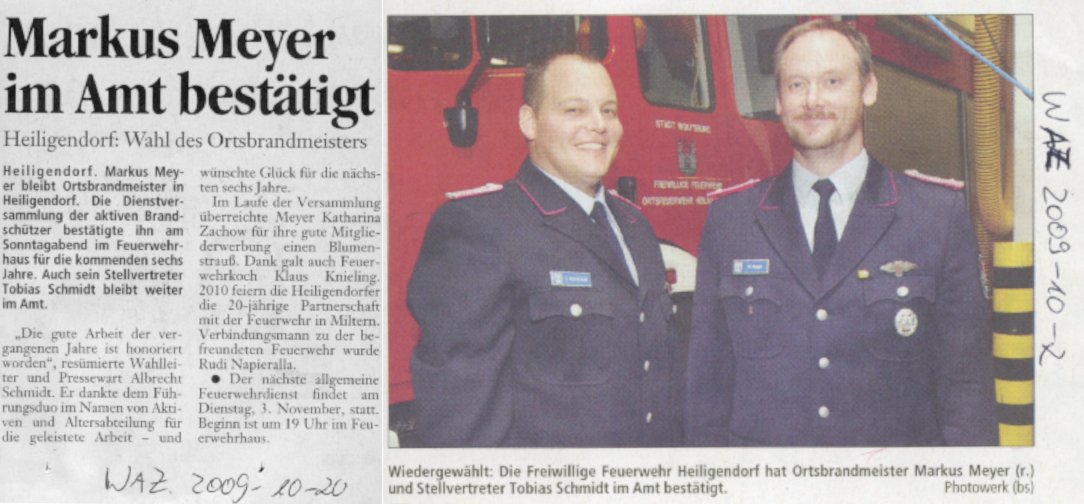 | 20.10.2009 | WAZ | Bericht über die Wiederwahl von Markus Meyer als Ortsbrandmeister und Tobias Schmidt als Stellvertreter |