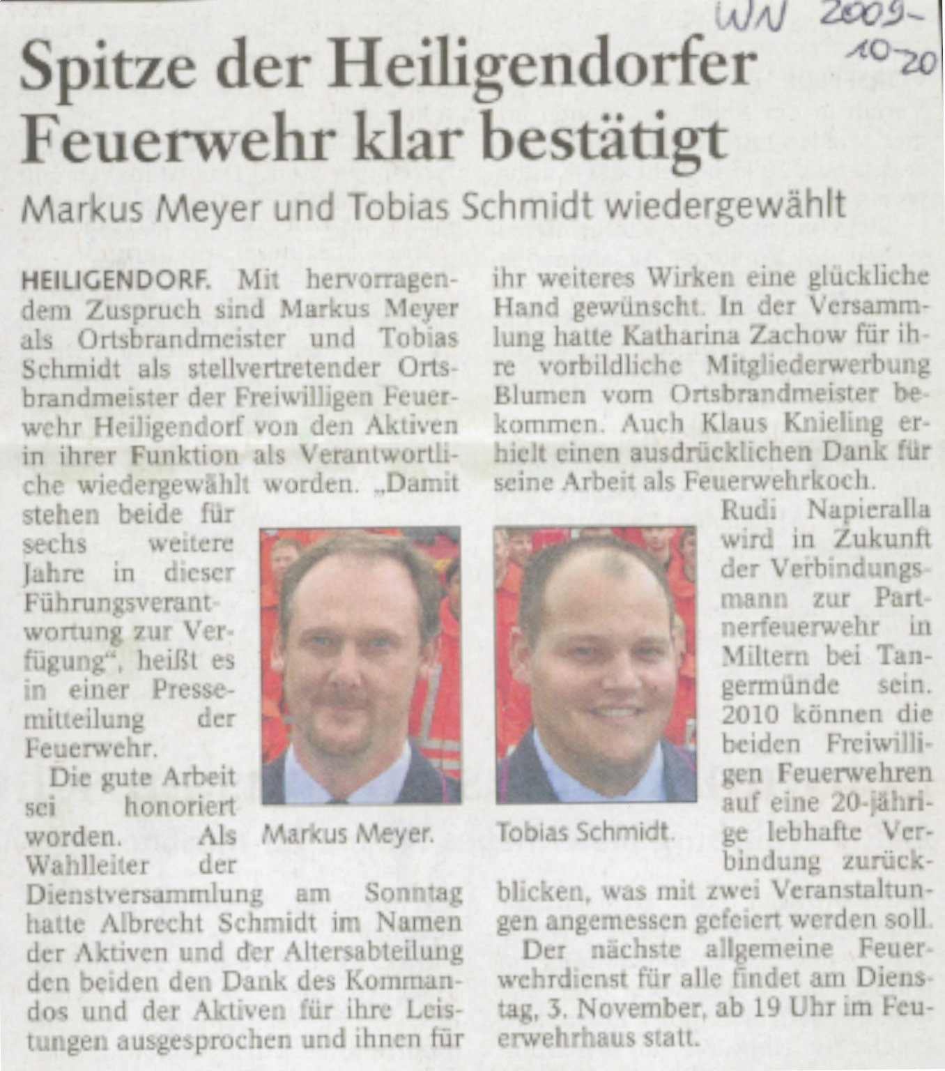 | 20.10.2009 | WN | Bericht über die Wiederwahl von Markus Meyer als Ortsbrandmeister und Tobias Schmidt als Stellvertreter |