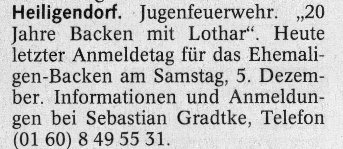 | 03.12.2009 | WN | Bericht über das vorweihnachtliche "Backen mit Lothar" |